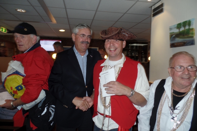 Uitreiking cd aan onze dirigent Arie. U ziet het goed, onze burgemeester heeft de cd uitgereikt.