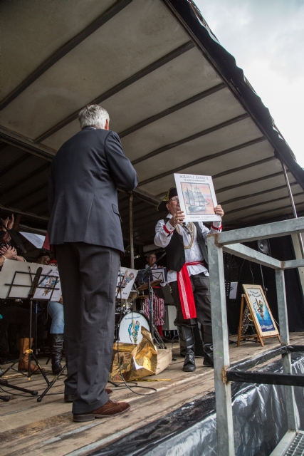 Na het ontvangst in het Kerk en Zalencentrum "De Voorhof" en na een lekker kopje koffie zijn we met zijn allen naar het hoofdpodium gelopen op het festivalterrein in het dorp. Daar werd omstreeks 12.00 de eerst CD uitgereikt aan onze dirigent Arie Seeuws. De CD werd uitgereikt door onze burgervader A. de Jonge.